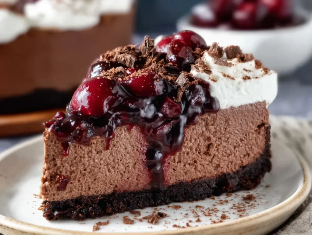 This Black Forest Cheesecake blends deep chocolate, cream cheese, and fresh cherries into a refined, indulgent dessert perfect for special occasions.