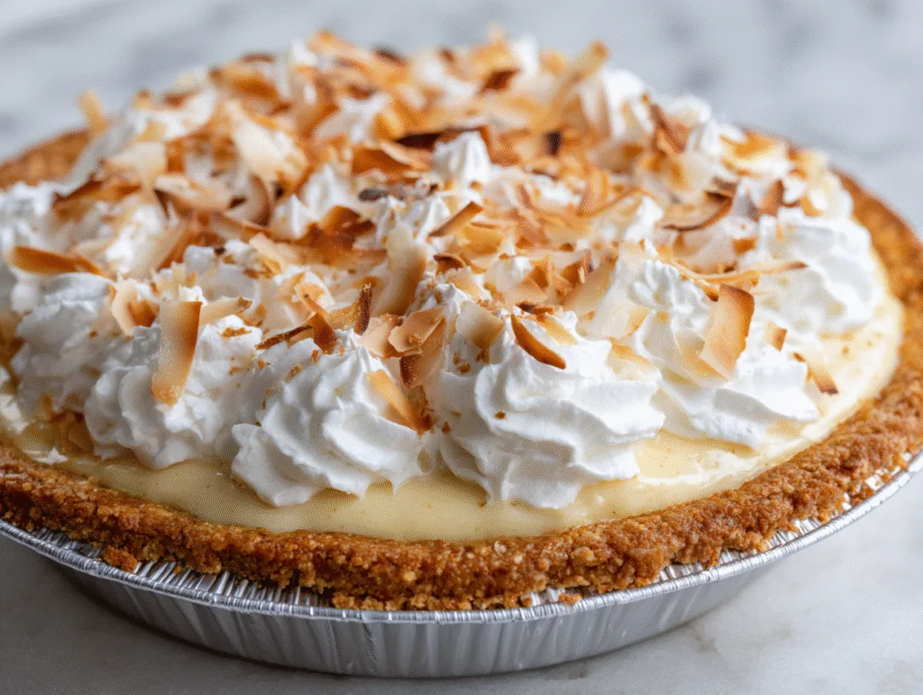 Once fully chilled, spread whipped cream evenly over the pie. Finish with a generous layer of toasted coconut flakes for texture and a golden finish. For a presentation inspired by https://www.foodnetwork.com/, keep the topping slightly rustic with soft peaks and scattered coconut. The layers of Dahlia Bakery Triple Coconut Cream Pie create a beautiful, creamy contrast when sliced.