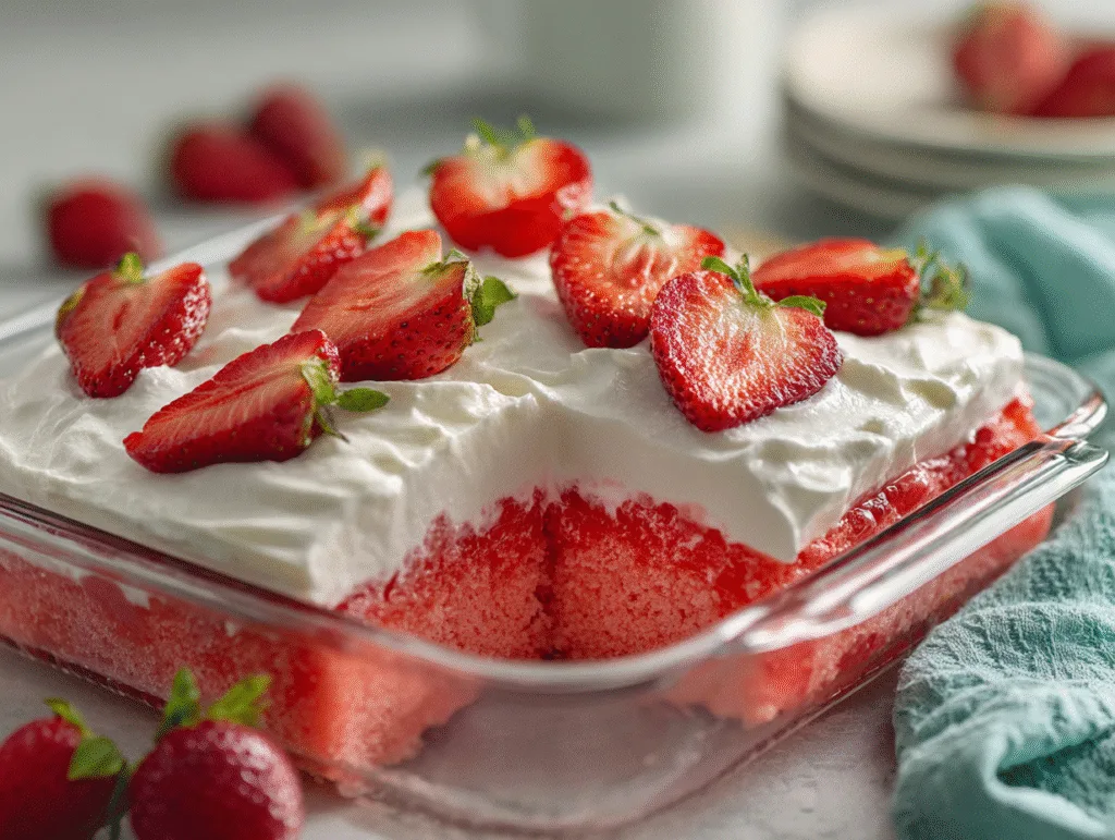 Once chilled, spread whipped topping evenly across the cake. Smooth the surface gently, then add fresh strawberry slices for a bright and fresh finish. For a clean presentation inspired by https://www.foodnetwork.com/, keep the topping even and the fruit neatly arranged. The vibrant color contrast makes Strawberry Jello Poke Cake especially appealing.